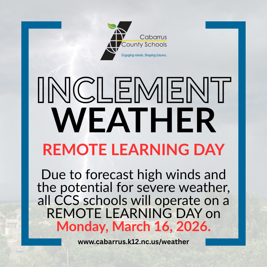 Good evening, Patriots families:The safety of our students and staff remains a top priority for Cabarrus County Schools. Due to forecast high winds and the potential for severe weather, Cabarrus Co...