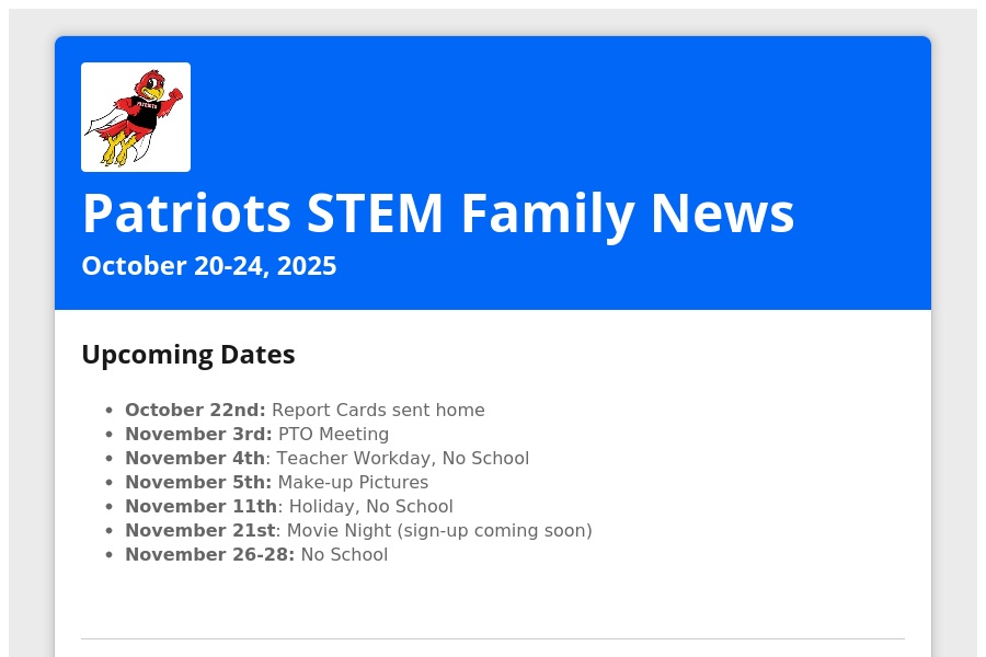 Patriots STEM Family News October 20-24, 2025 Upcoming Dates October 22nd: Report Cards sent home November 3rd: PTO Meeting November 4th : Teacher Workday, No Schoo. . .