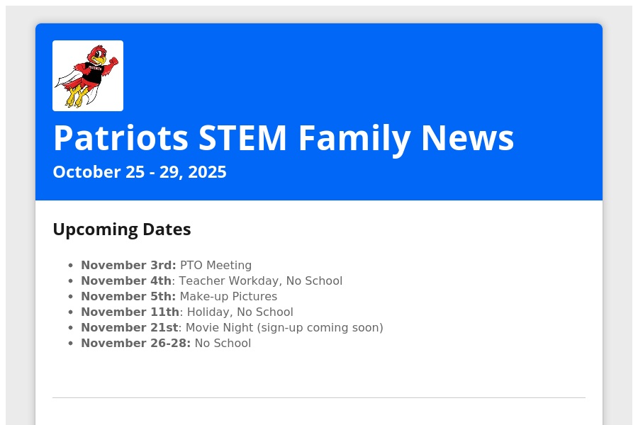 Patriots STEM Family News October 25 - 29, 2025 Upcoming Dates November 3rd: PTO Meeting November 4th : Teacher Workday, No School November 5th: Make-up Pictures . . .